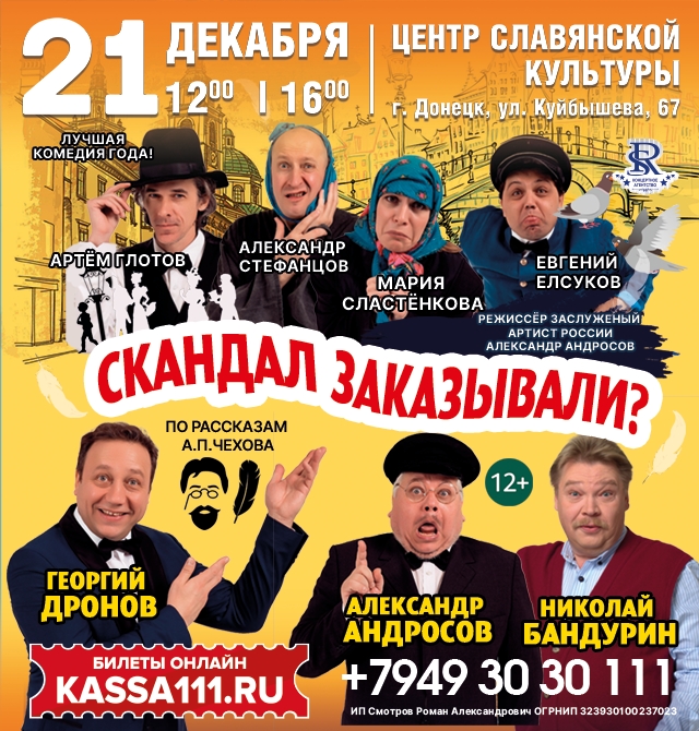 21 декабря 2025, г. Донецк, Центр славянской культуры, 12:00 и 16:00 - спектакль-комедия «Скандал Заказывали?» по рассказам А.П.Чехова
