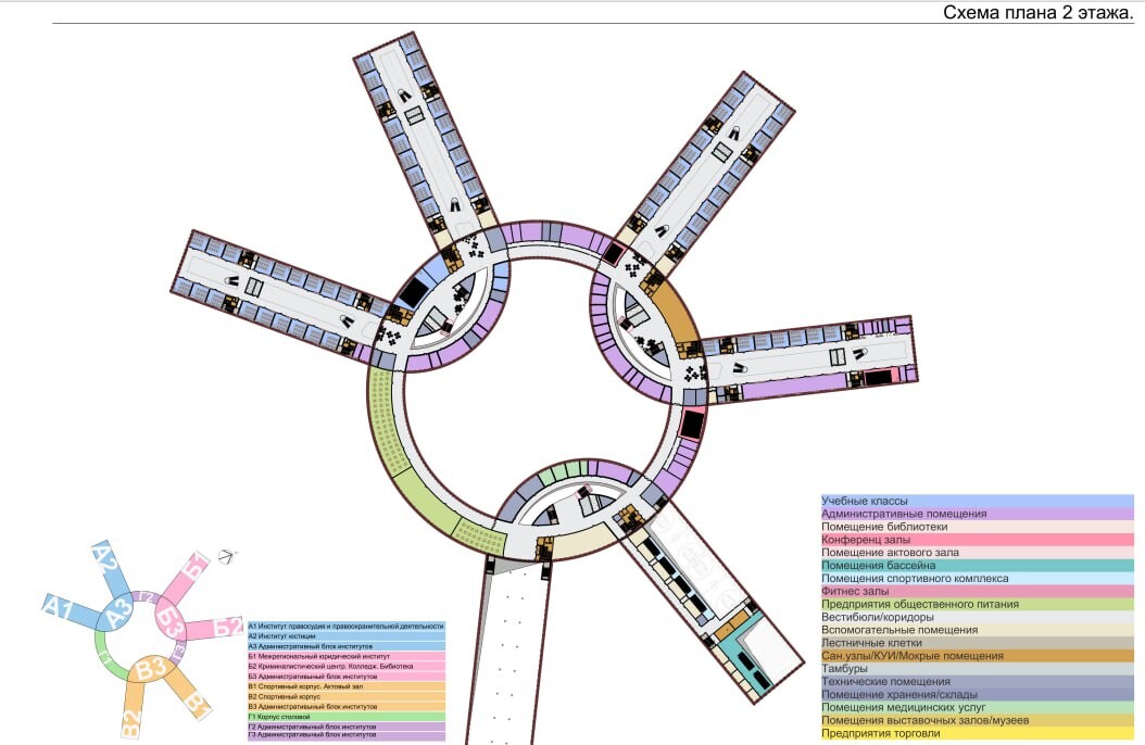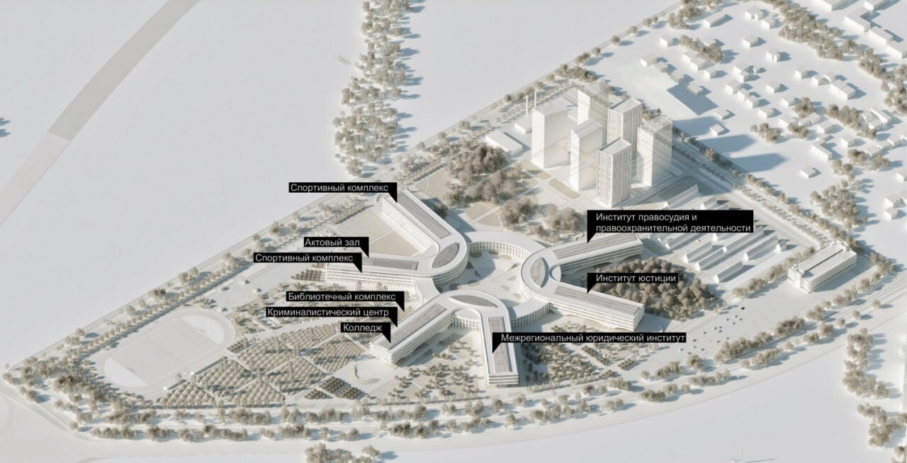 Архитектурное решение комплекса обещает стать знаковым. Центральное здание спроектировано в круглой форме, напоминающей древнеримский Колизей. Внутреннее пространство этого круга будет отдано под обширный парк. От этого зеленого ядра лучеобразно разойдутся корпуса, где разместятся три ключевых подразделения вуза: Институт правосудия и правоохранительной деятельности, Институт юстиции и Межрегиональный институт.