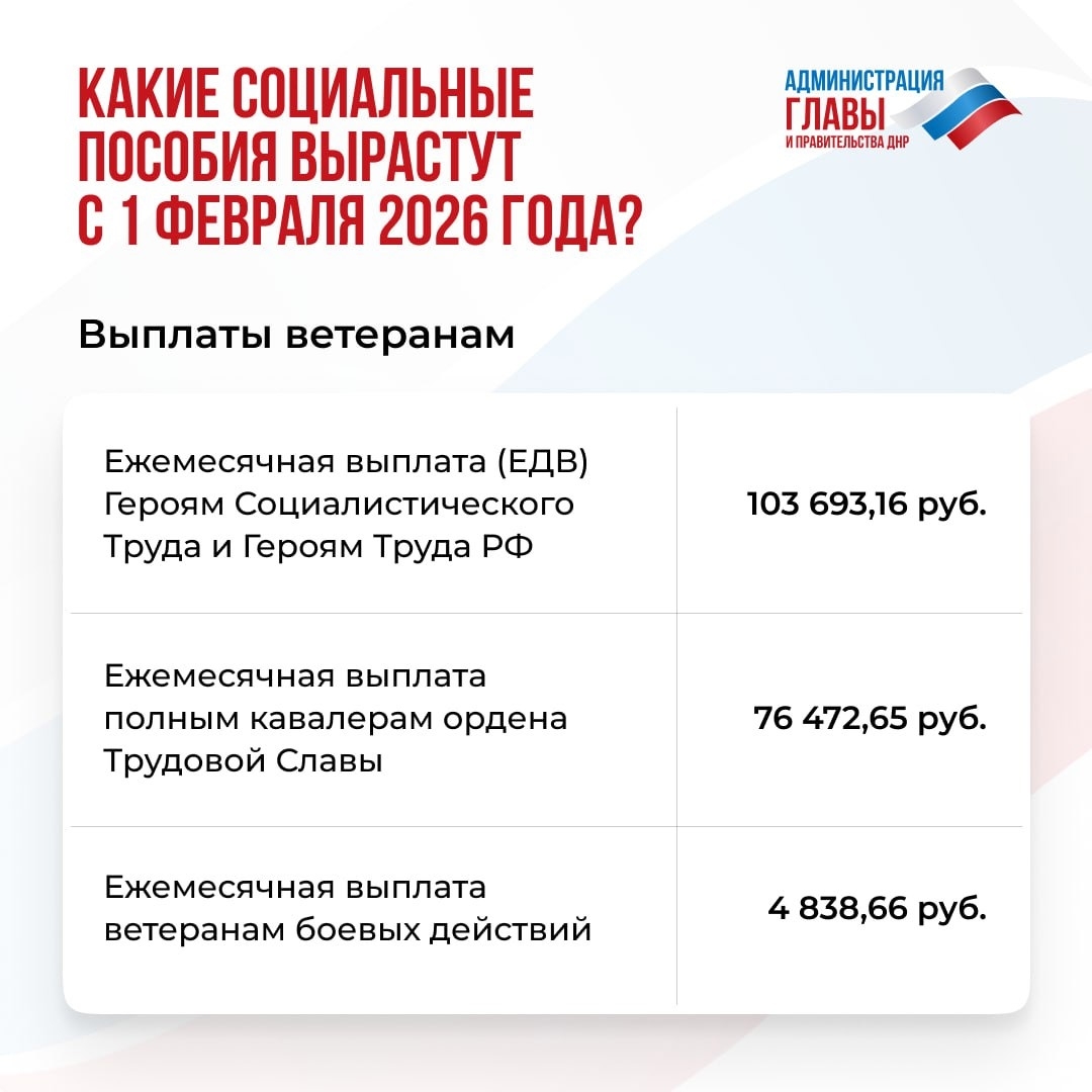 Кроме того, для федеральных льготников из ДНР увеличилась стоимость набора социальных услуг (НСУ), входящего в состав ЕДВ. С 1 февраля размер НСУ составляет 1825,25 рубля, из которых: